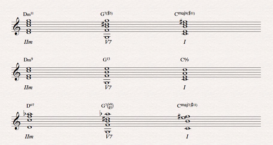 Dưới đây là 3 thí dụ về diễn tiến hợp âm thường có của Jazz, mà chúng ta vừa nói bên trên: